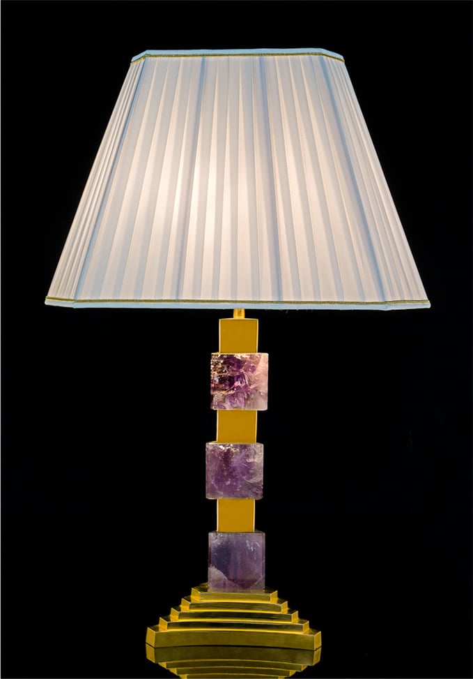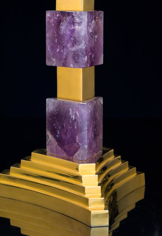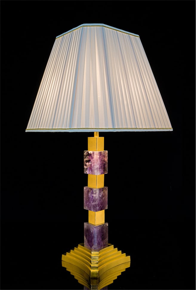 Triangle base pair of lamps in amethyst and ormolu gilding bronze.