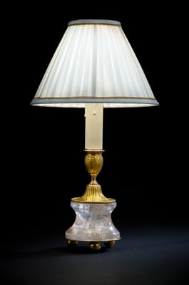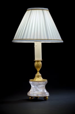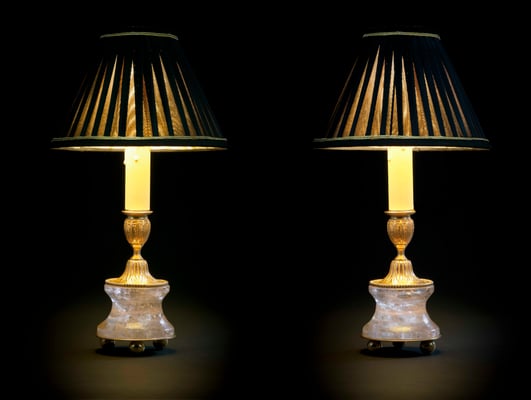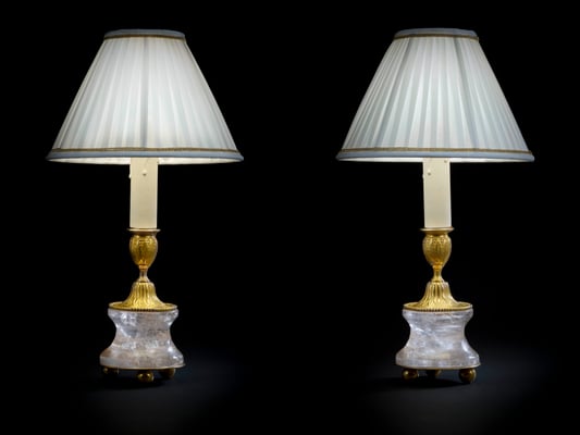 Very chic pair of rock crystal pair of lamps /candlesticks in the typic style of LOUIS THE XVI th . So you can used as you want ,depend of your interiors and mood. The base is carved in a single piece of rock crystal stone. The top is made in FRANCE in Bronze ,gilding by high end "French Bronzier" in PARIS who also working for the most well known companies (HAUTE COUTURE and JEWELRY ...). The lampshade as you can see can be easily take off . You have as a first choice the gold or the white color for the lampshade. If you want an extra color it will possible for the same price , just take more time to do it.(hand made around 3 weeks).