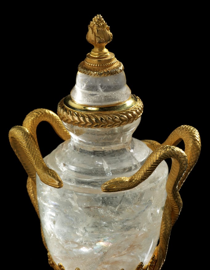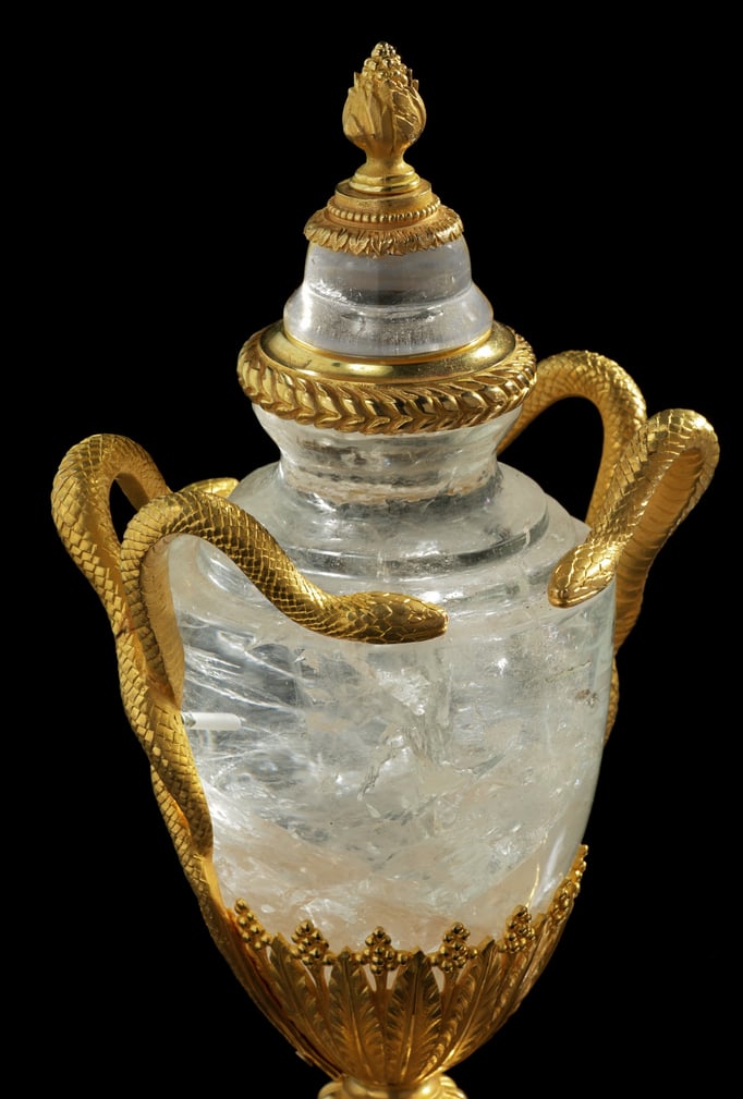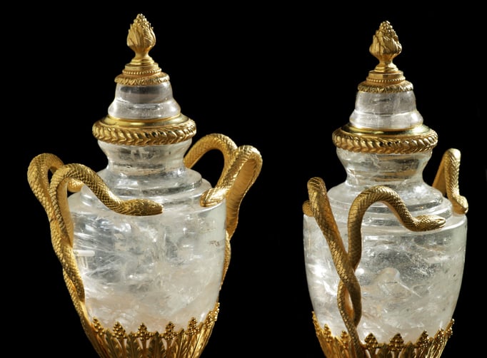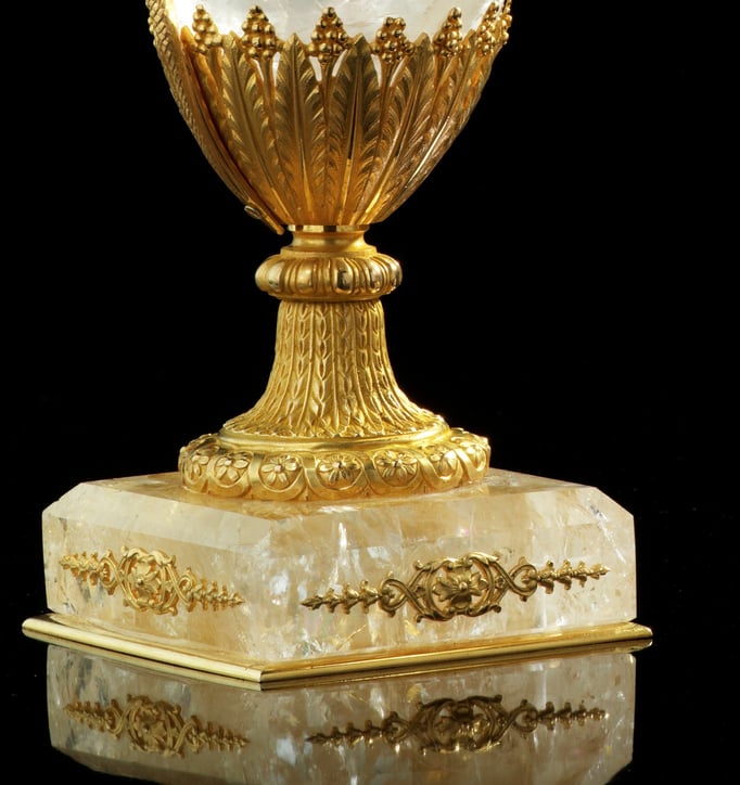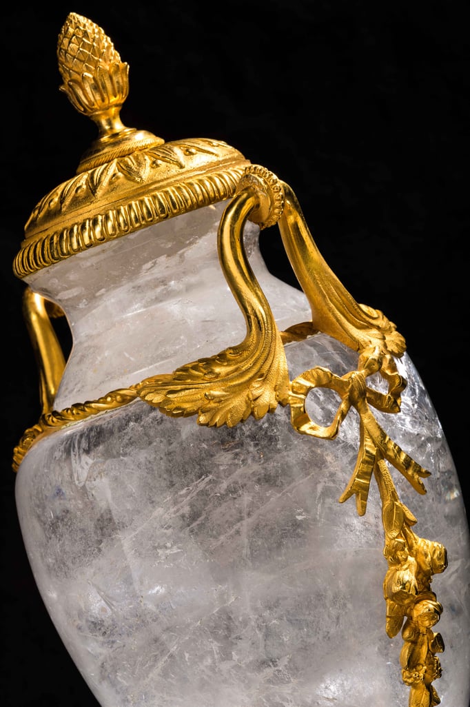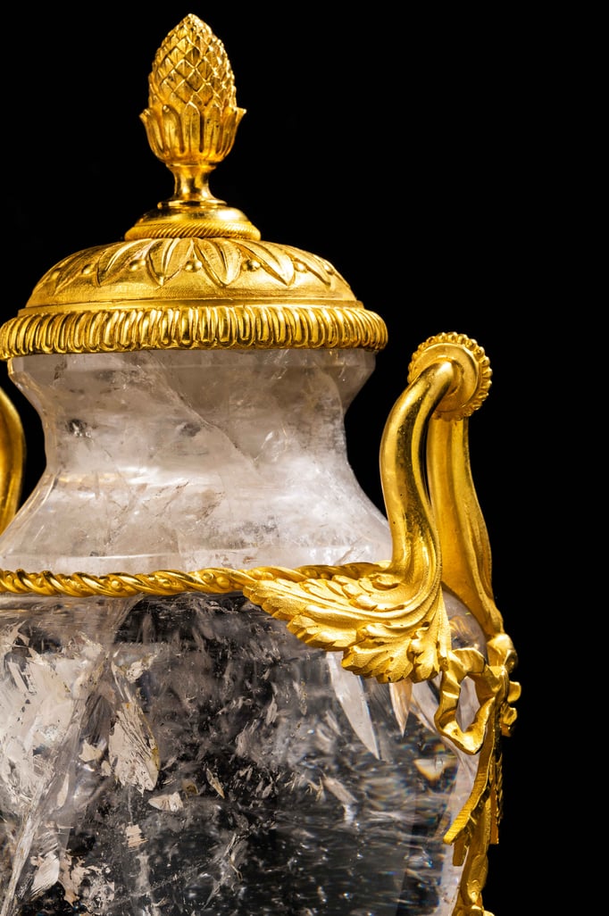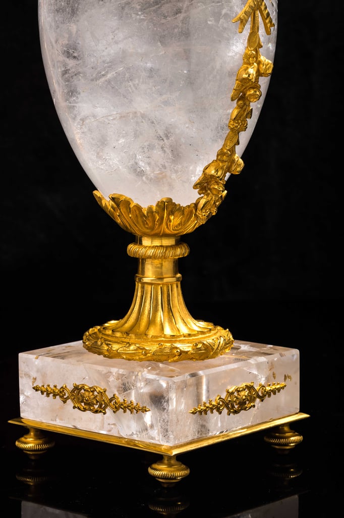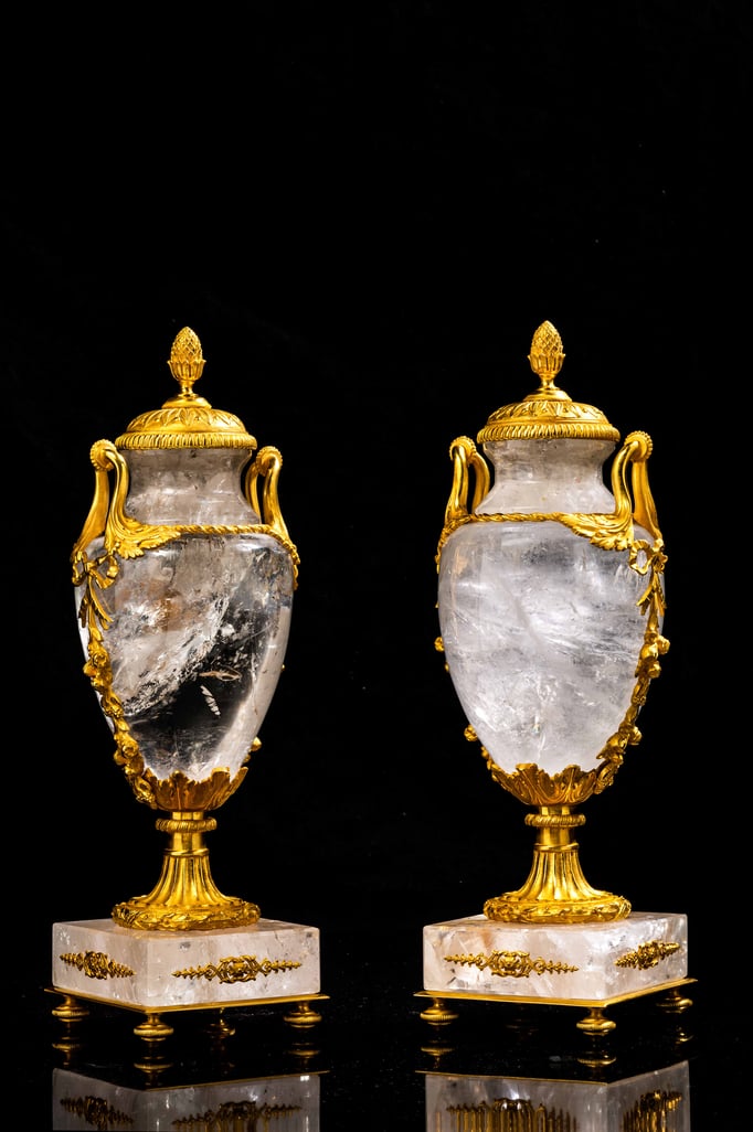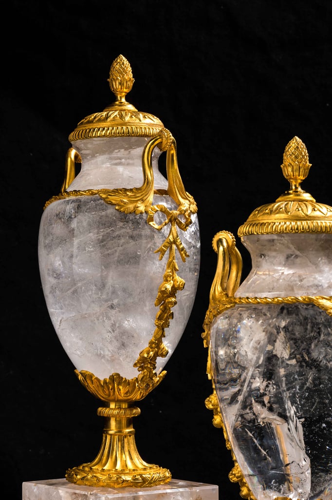 Contemporary pair of rock crystal and ormolu bronze in the style of Louis XVI urns.